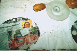 Altbackene und frische Brötchen waren auf einer festlichen Tafel angerichtet. Das Tischtuch war benäht mit Drucken von Zeitungsausschnitten. Die auf Seide gedruckten Ausschnitte über Krieg und Völkermord waren rund zugeschnitten und dienten damit als "Platzteller". Bei Brot und Wein die Menschen zusammenbringen und gucken, was geniessbar ist, war das Motto der Künstlerin. (Ausschnitt aus einer Stadtteilzeitung)